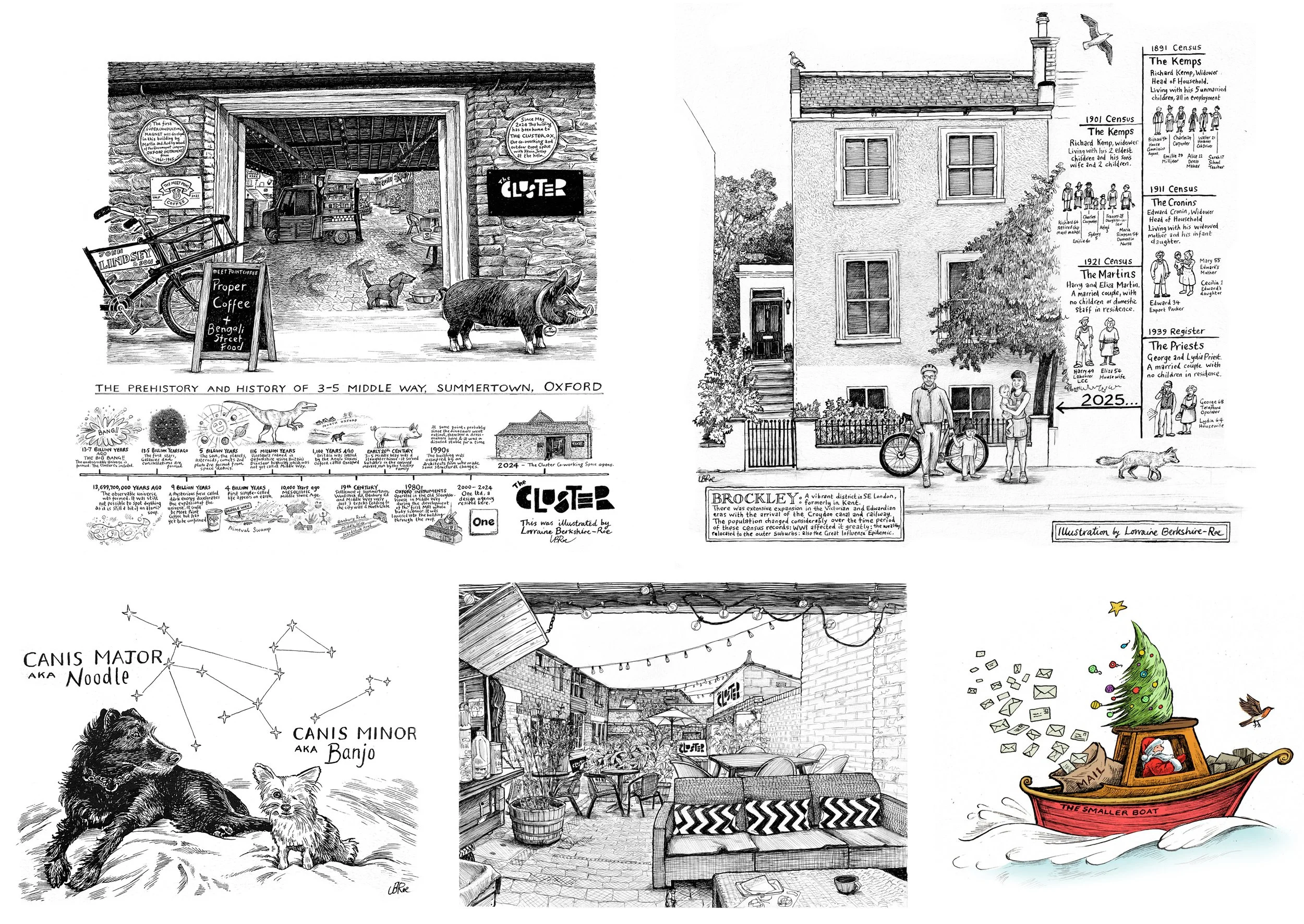 I work in dip pen and ink in black and white and also colour. I have a detailed style which allows me to create illustrations with a wide variety of content. This includes buildings with local and historical details, including a timeline if required, maps, in-situ drawing, realistic representation of animals and settings, portraits and illustration for design, editorial and promotion etc.