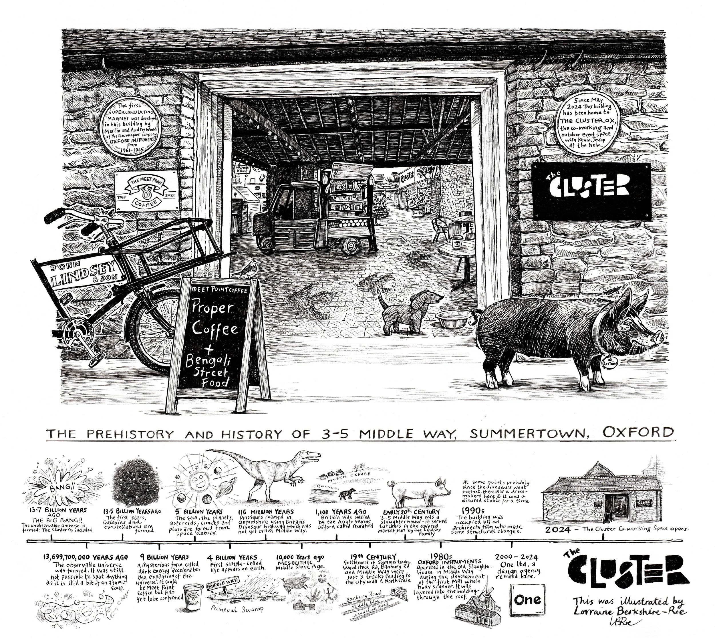 The Cluster is a co-working business in Summertown, Oxford. The top left illustration was commissioned by Kevin Jessop, owner of the Cluster: I asked him if I could use his business as the setting for my commissions showcase and I was very pleased that he said yes.