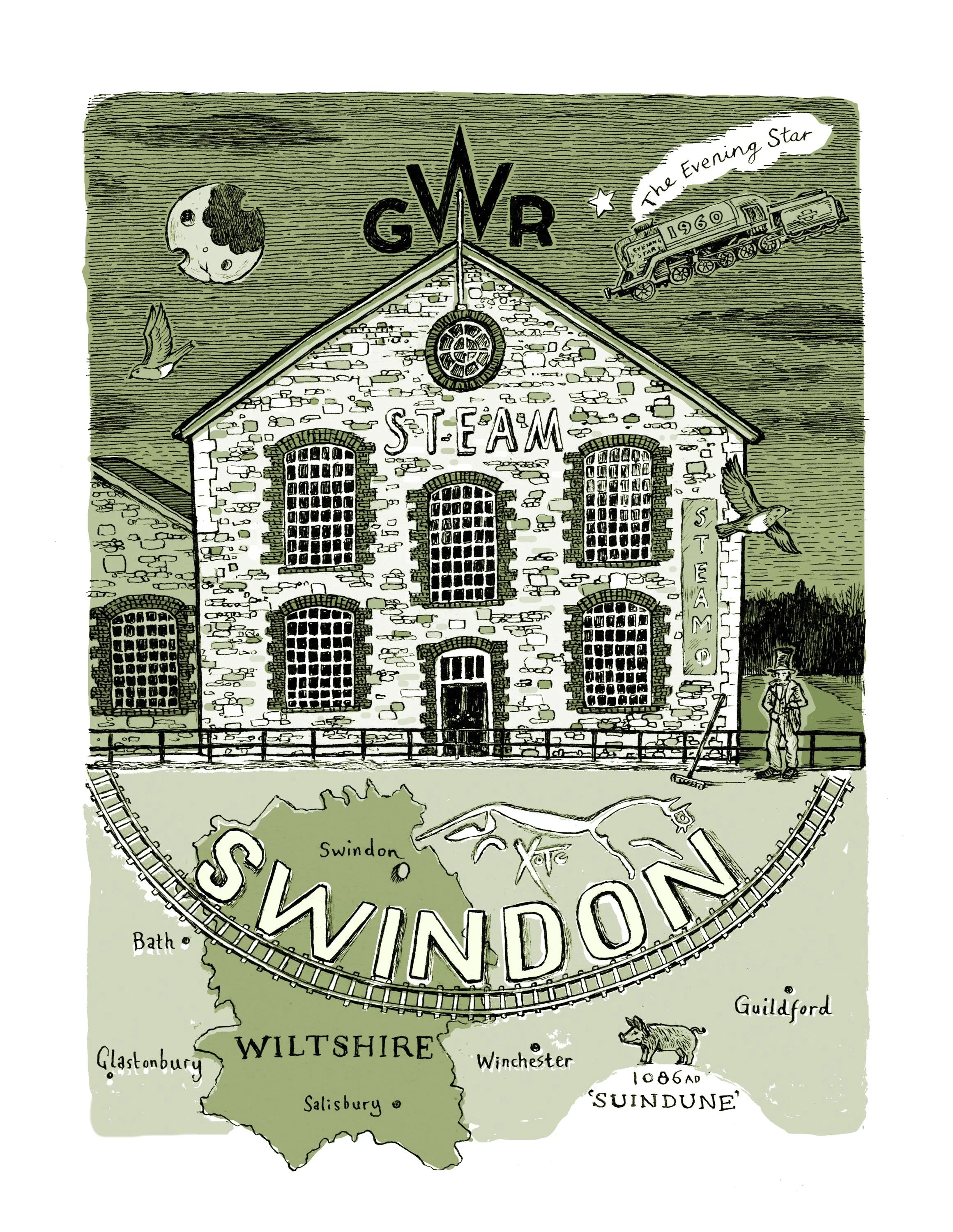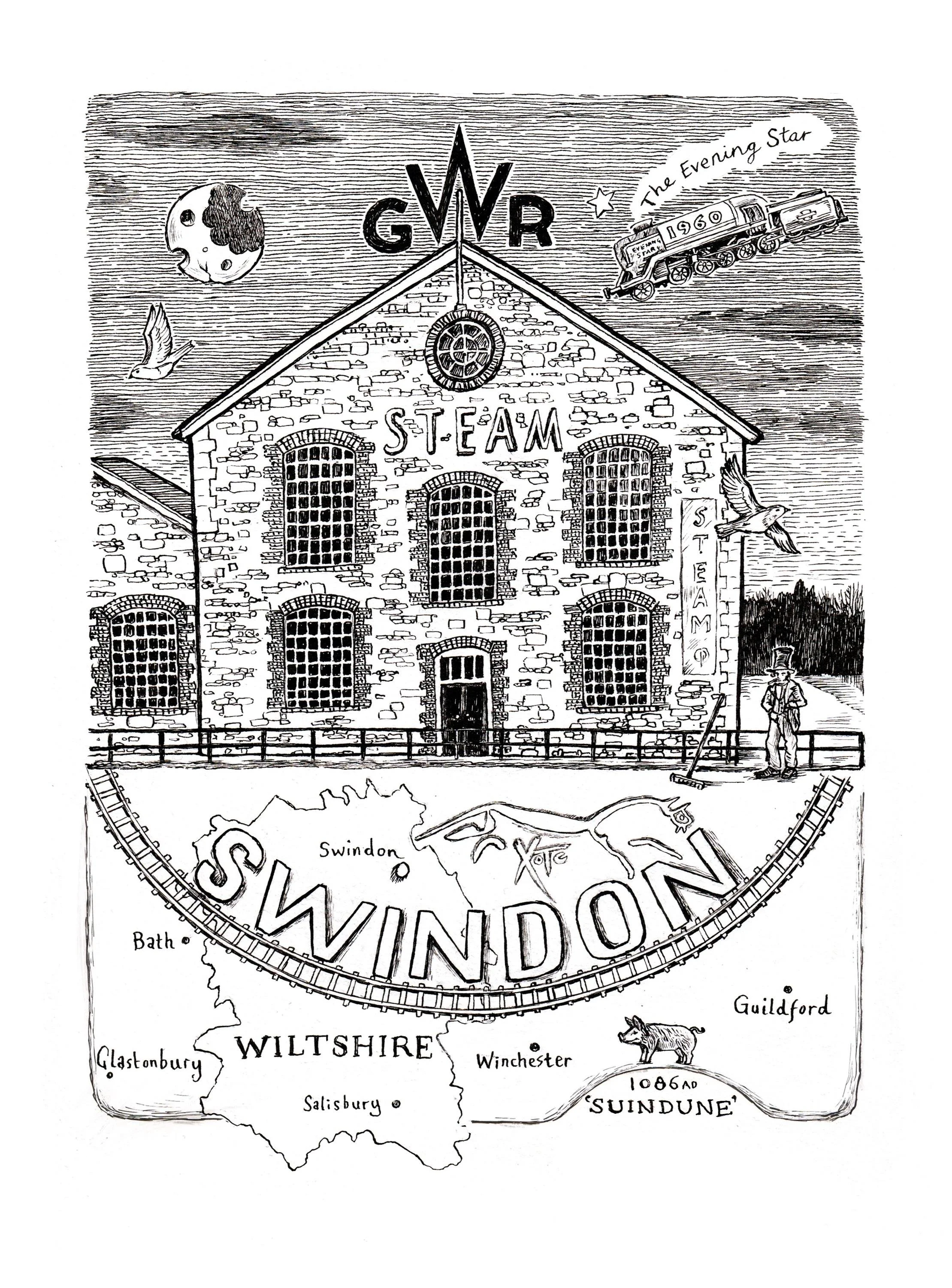 This illustration is a pen and ink illustration which was scanned and coloured using the programme Photoshop. It features the Swindon Steam museum of The Great Western Railway with additional historical details of Swindon town and a map of Wiltshire.